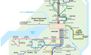 Several bus routes connect the hospital and town centres. Local Great Yarmouth buses 1, 1A, 2 and 8 all stop beside the hospital.